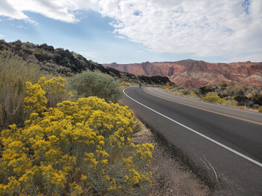 Elevation gain: ~2,600 ft of climbing (the climb up Snow Canyon alone is 4 miles, 4% grade, and 1,450 ft elevation gain). Clockwise or counter clockwise – either climb Snow Canyon or “The Wall”