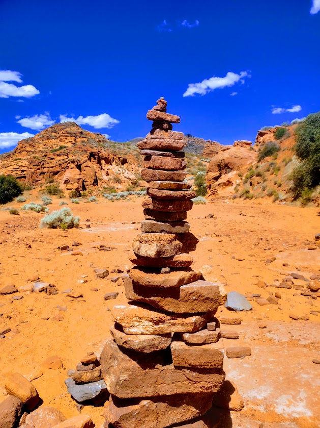 Getting there: I-15N from St. George, Exit 10 to Washington. Left onto Green Springs Drive, immediate right onto Buena Vista Blvd. Follow. In about 1 mile, turn left onto the dirt road immediately after the fire station. Follow it for about 1.2 miles to the intersection of another dirt road and turn left onto this dirt road. In about a half mile you’ll see the parking area, gate and trailhead. (Directions are a bit tricky & terrain is variable–high clearance / 4-wheel drive vehicle helpful.) Took me 3x until I finally found it.