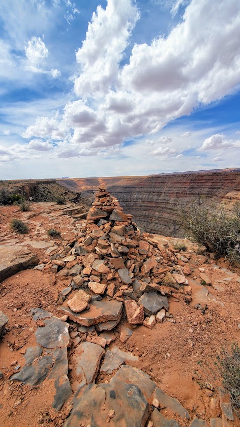 Getting there: There are no signs for this trailhead. It’s marked only by a huge cairn pyramid at the start of the trail and at the bottom. At Goosenecks State Park, take the dirt road at mile marker 3 (before the entry gate) and stay left when it forks. A 2WD car can make it to the first unmarked “parking area,” and it’s just .25+ to the trailhead from there. Otherwise, a 4 WD, high-clearance vehicle can take you to a “parking area” closer to the trailhead.