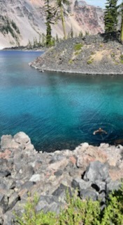 What truly made the visit unforgettable was standing on Wizard Island, surrounded by mesmerizing views of Crater Lake, and then immersing myself in the deepest, bluest, purest lake in the country (in the refreshing summer temps of ~57 F)—priceless.