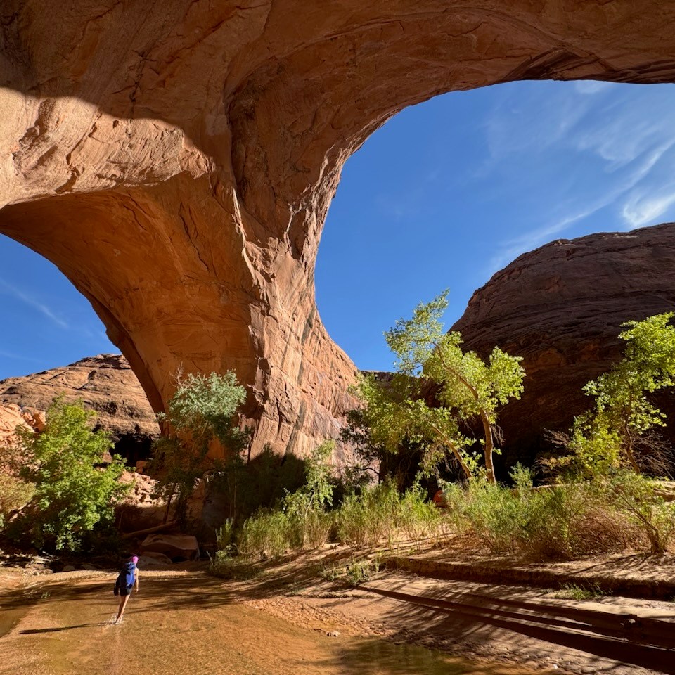 I chose the easy way to the arch via the Hurricane Wash Trailhead as I was testing my new backpacking gear. As the trail name suggests, you hike through a sandy, rocky wash for about 4.5 miles. Beyond that, you enter the river canyon, encountering shallow water crossings (inches deep and 6 feet wide in spots), dodging quicksand, and bushwacking through overgrowth and reeds. Gradually, you begin to catch glimpses of the towering red walls, and the scenery becomes more compelling, distracting you from the slog portions of this oft-proclaimed “epic hike.”. In about ~3 miles you reach the spectacular Jacob Hamblin Arch. I