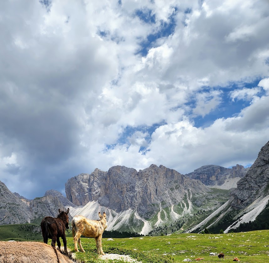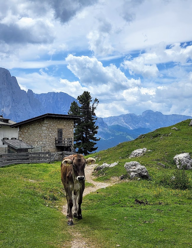 We took the Ortisei-furnes Gondolo and the Fummes-Seceda Cable Car to the summit and started our hike there. We stopped for refreshments at our first rifugio (translated as refuge/shelter /haven) before we hit our second mile. A young, handsome boy wearing traditional German lederhosen served our giant size charcuterie feast . The cheese was handmade by his family, and courtesy of their free-range cattle, the bread was baked fresh that morning. (Warning, weight can happen while hiking here.)