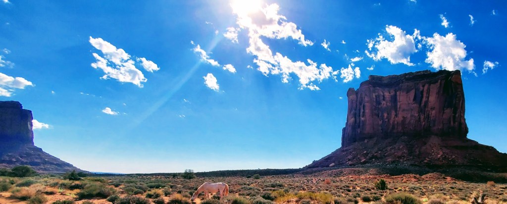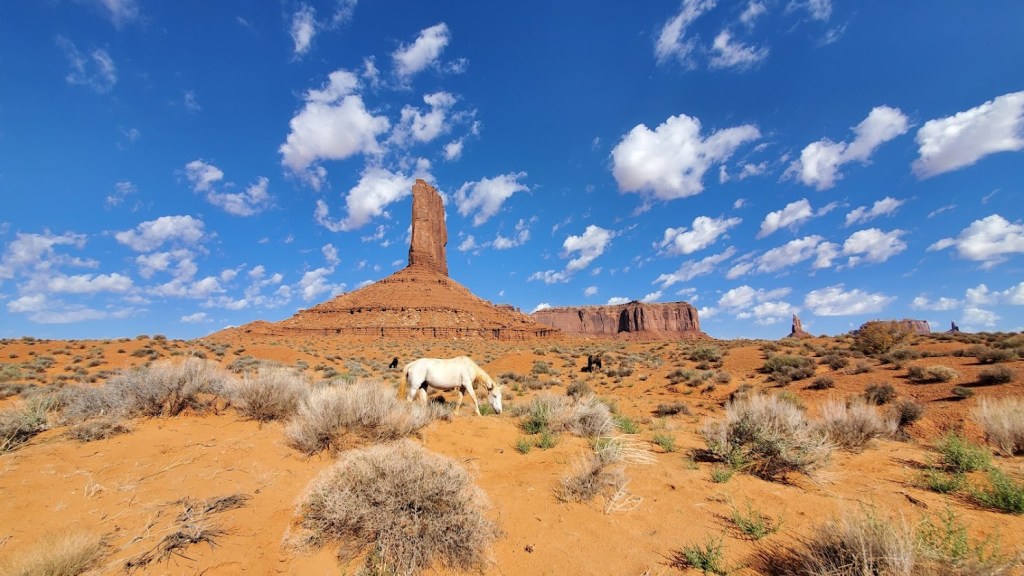 The sandy, mostly flat, Wildcat trail loops around West Mitten Butte and provides views of East Mitten Butte, Merrick Butte, and the wider cliffs of Sentinel Mesa along the way. As you enjoy the iconic Southwestern walkabout, you may get lucky as I did with an appearance of local equines. Film buffs will recognize this scenery as the backdrop for many Westerns.