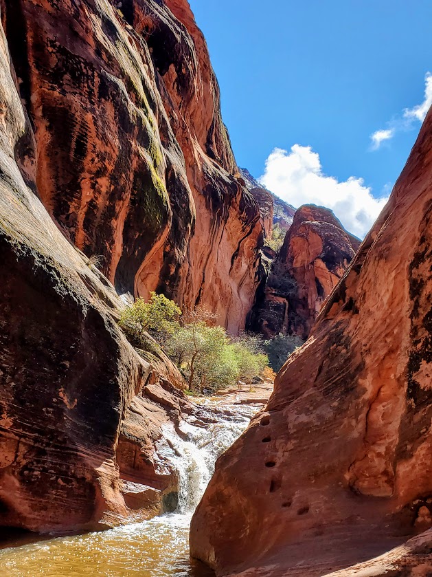 Short and splendid, this incredibly scenic area features a waterfall, a creek, a slot canyon, a cave, a mini-rock / rope climb, cliffs to scale—oh, my! So much is the span of a short out and back trail (2 miles total). It’s like a mini-Zion. The bad news is that it has the crowds to match. (Sigh.) (Reality pic is the last one in the slide show.) Thankfully everyone is respecting the natural beauty and leaving no trace. The good news is that solitude it just an upcliff scramble or mini-rope rock climb away…