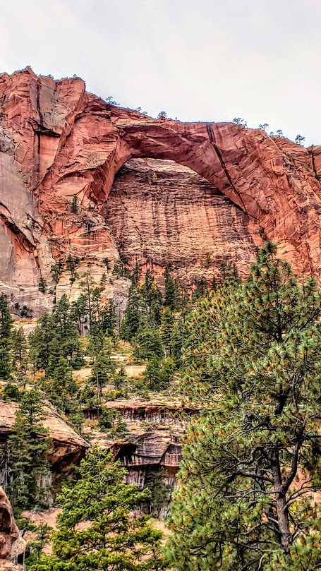 Continue following the trail along the creek another mile or so until you reach the junction for Kolob Arch. This trail is less distinct and a little more rugged. The distant view of the arch (possibly the largest free-standing arch in North America) is ok, but wow factor is a bit muted without a blue sky backdrop.)
